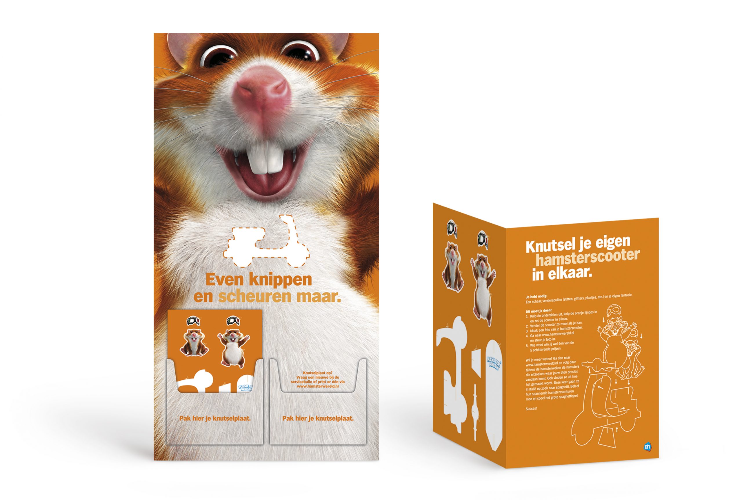 Tijdens de Hamsterweken van Albert Heijn wordt er ook altijd aan de kinderen gedacht. In teamverband met de copywriter bedacht ik verschillende campagnematerialen, waaronder deze knutselplaat. De kinderen kunnen een scooter maken samen met de vrolijke hamsters. Bij de ingang van de winkel konden ouders een knutselplaat meenemen.